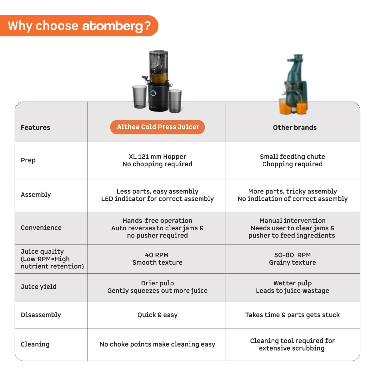 Atomberg Althea Cold Press Juicer | High Nutrition | Easy Assembly & Cleaning | Intelli Rev™ | Advanced Safety Features | Ideal for Fruit, Veggie Juices & Nut Milks